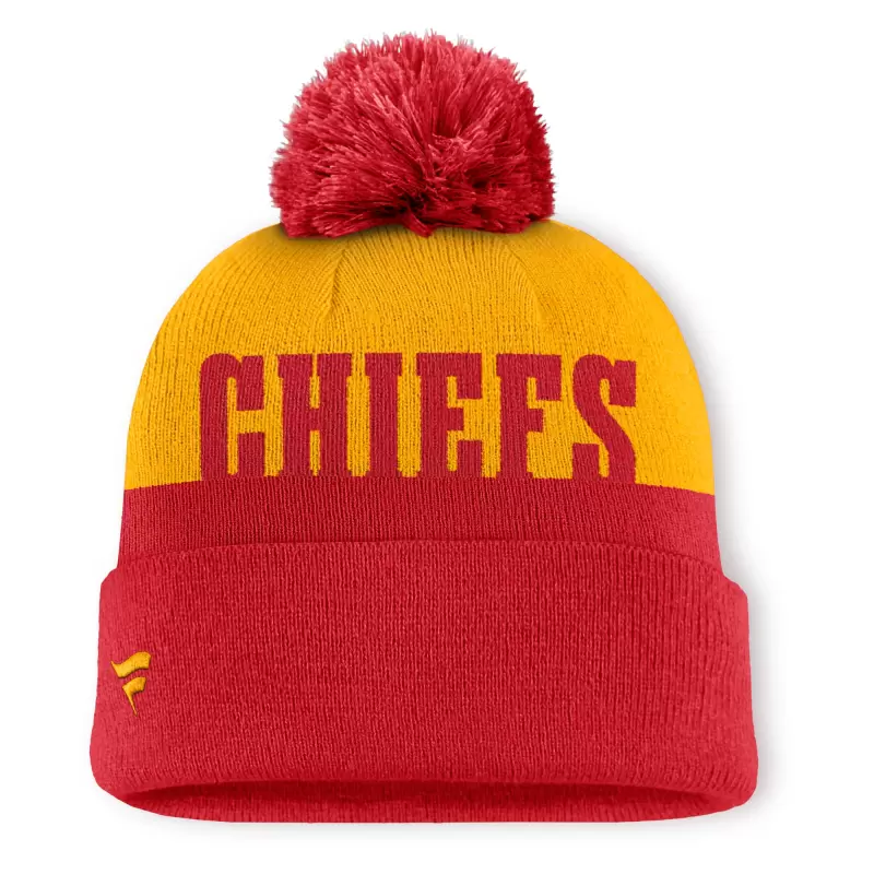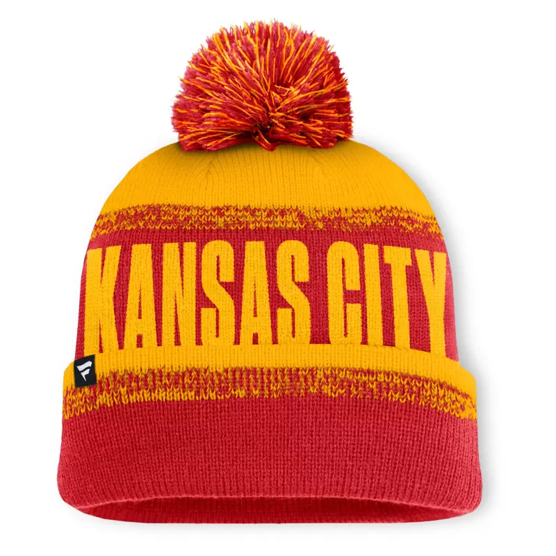 Men’s Fanatics Red/Gold Kansas City Chiefs Play Action Cuffed Knit Hat with Pom