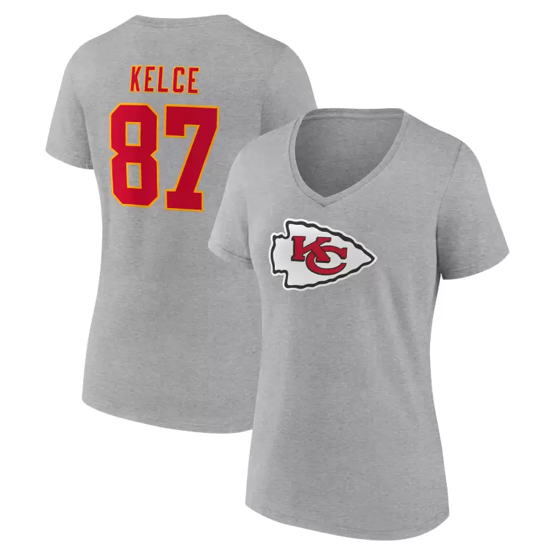 Women’s Travis Kelce Gray Kansas City Chiefs Icon Player Name & Number V-Neck T-Shirt