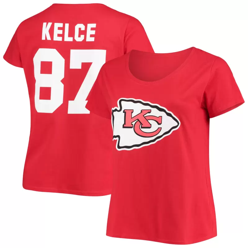 Women’s Travis Kelce Red Kansas City Chiefs Plus Size Fair Catch Name & Number Scoop Neck T-Shirt