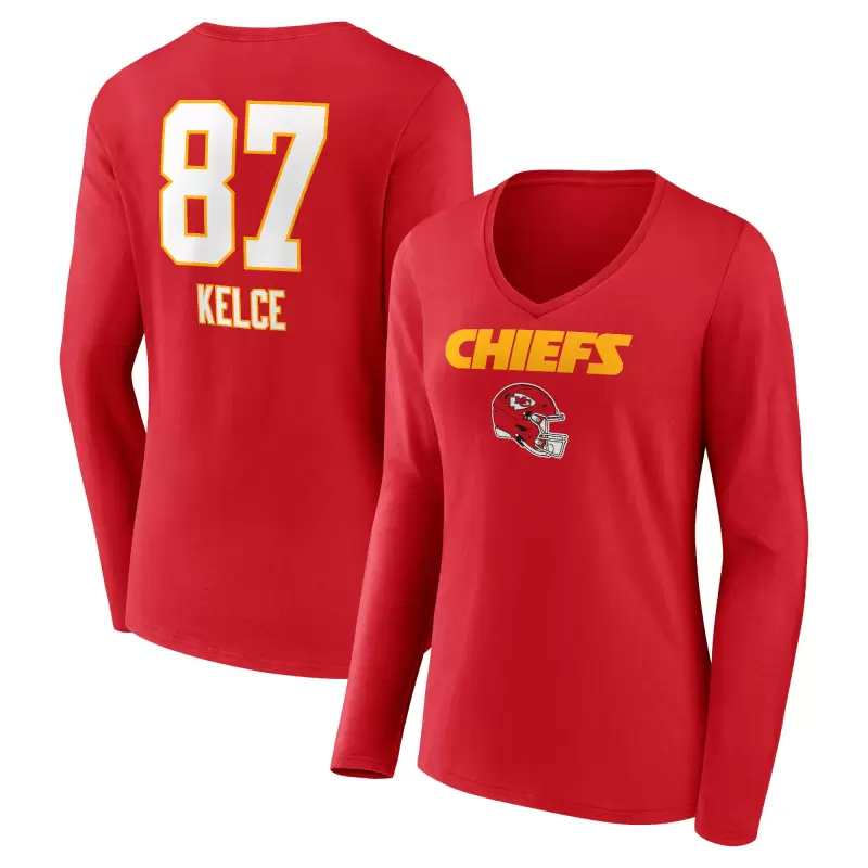 Women’s Travis Kelce Red Kansas City Chiefs Team Wordmark Player Name & Number Long Sleeve V-Neck T-Shirt