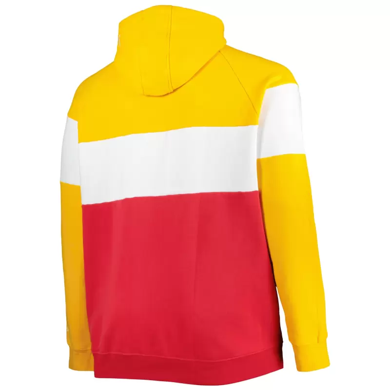 The Men’s New Era Red/Gold Kansas City Chiefs Big & Tall Current Colorblock Raglan Fleece Pullover Hoodie is the perfect way to show your support for the Kansas City Chiefs. Made from a soft cotton and polyester blend, this midweight hoodie features a fleece lining for added warmth during chilly game days. The colorblock design and screen print graphics proudly display your Kansas City Chiefs pride, while the raglan sleeves and scuba hood with drawstring provide a comfortable and stylish fit. Whether you’re cheering from the stands or simply showing your support, this hoodie is the perfect way to represent the Kansas City Chiefs in style.