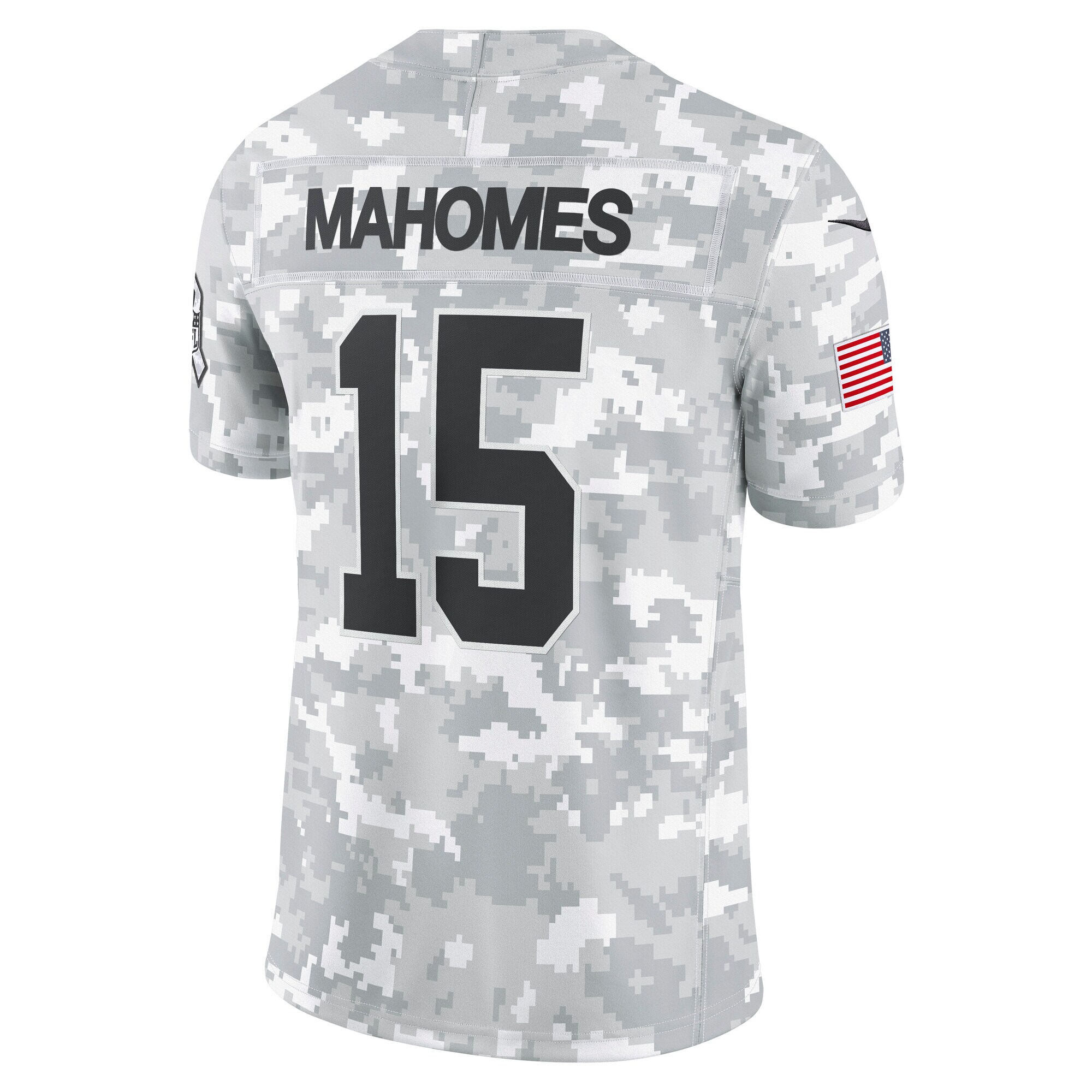 This Patrick Mahomes Salute to Service Limited Jersey delivers an authentic touch on game day with premium twill team appliques and a tribute to those who serve their country. Its special design is dedicated to the NFL’s charitable initiative and features an allover arctic camo pattern and military-inspired details. Double pique fabric and sweat-wicking Dri-FIT technology provide consistent comfort as you represent the Kansas City Chiefs and active or retired service members.