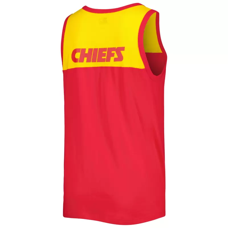 The Men’s Starter Red/Gold Kansas City Chiefs Logo Touchdown Fashion Tank Top is the perfect way to show unwavering support for the Kansas City Chiefs. Bold screen print graphics and comfortable cotton construction make this tank top ideal for game day or any day you want to show your Chiefs pride. Front and back yoke seams add a stylish touch, while the crew neck ensures a comfortable fit. Whether cheering from the stands or relaxing at home, this tank top is sure to become a favorite.