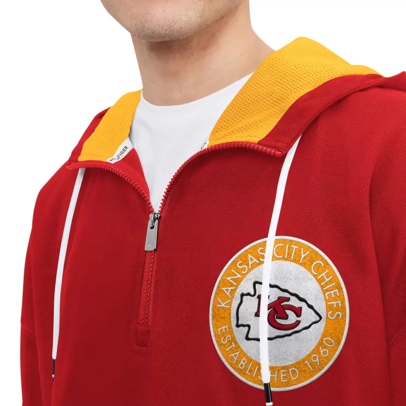 The Tommy Hilfiger Men’s Tommy Hilfiger Red Kansas City Chiefs Aaron Quarter-Zip Hoodie is the perfect way to show your support for the Kansas City Chiefs. Made from a comfortable blend of polyester, cotton, rayon, and spandex, this midweight hoodie is suitable for moderate temperatures. The mesh lining on the interior hood provides added warmth, while the woven stripes at the waist add a touch of style. The front pouch pocket is perfect for storing your essentials, and the hood with drawstring ensures a snug fit. Whether you’re cheering on the Chiefs at the stadium or just relaxing at home, this hoodie is sure to keep you comfortable and stylish.