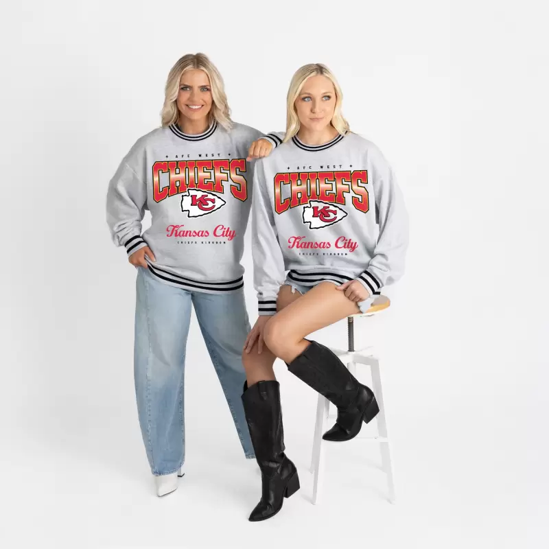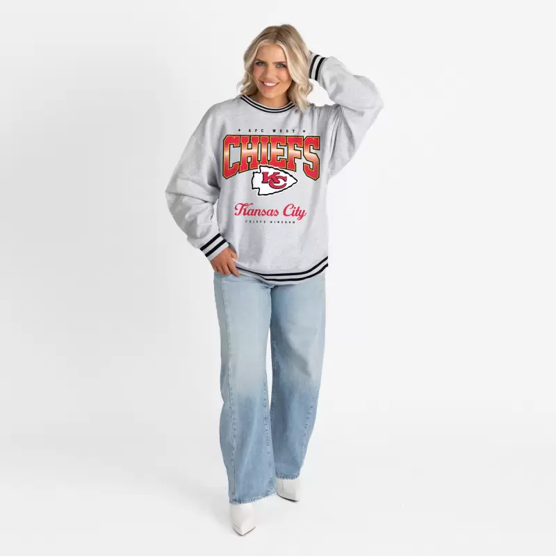 On those cooler game days, cozy up in this Gameday Couture Oversized Gridiron Drive Ringer Stripe Sweatshirt by Gameday Couture. Designed with a spacious, oversized fit, this midweight sweatshirt features a cozy fleece blend of cotton and polyester for ultimate comfort. The striped, ribbed detailing on the neckline, sleeves, and waistband adds a touch of classic style, while the screen print Kansas City Chiefs graphics proudly display your team spirit.