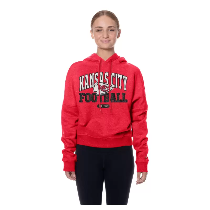 Showcase your appreciation for the rich tradition of the Kansas City Chiefs with this New Era Throwback Boxy Hoodie Sweatshirt. Made for moderate temperatures, the midweight sweatshirt features a relaxed, boxy fit, providing a loose and roomy feel across the chest, shoulders and body. Dropped shoulder seams contribute to the relaxed look, while the adjustable drawstring hood allows for a customized fit. The fabric applique with glitter team name and embroidered team logo across the chest offer a vintage yet elegant design, a salute to the legacy of the team and the loyal fans who have supported them through the decades.