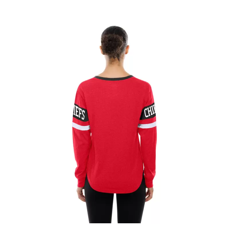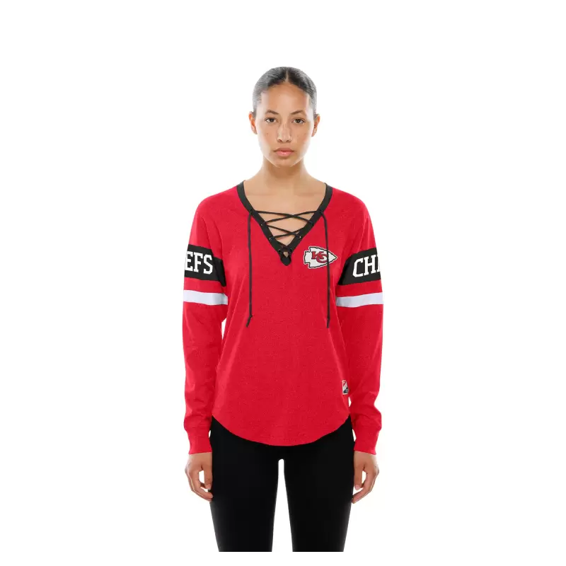 Showcase your timeless Kansas City Chiefs pride with this Throwback Lace-Up Long-Sleeve T-Shirt from New Era. The classic fit and rounded hem provide a flattering silhouette while the rib knit cuffs offer a snug fit and durable stretch. The team logo embroidered at the left chest and team name printed on both sleeves put your love for the Kansas City Chiefs on full display, making this a must-have tee for any dedicated fan.