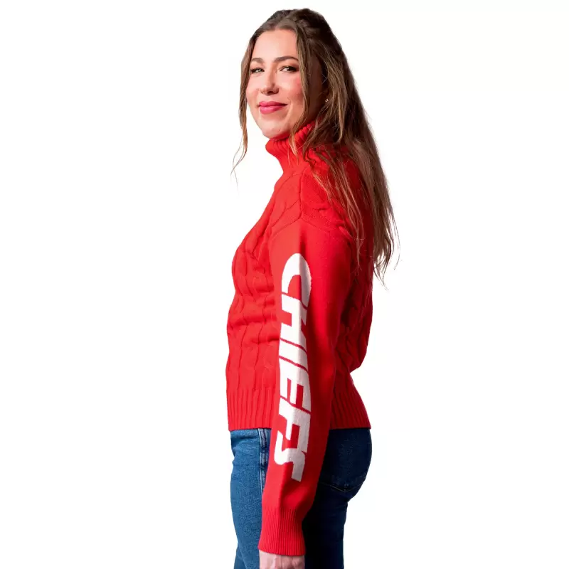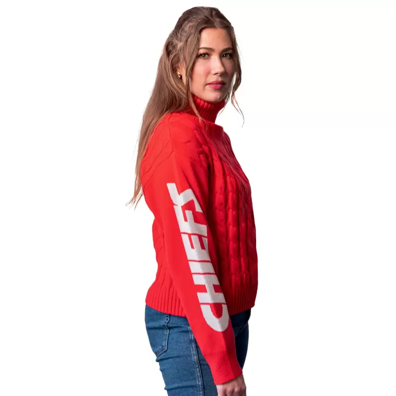 Stay warm and look good while doing it with this Sylvie Chunky Cable Knit Tri-Blend Sweater from the Lusso x Kansas City Chiefs collaboration. Featuring a trendy cable-knit design and Kansas City Chiefs graphics down the sleeves, this sweater adds team flair and style to any outfit. With a cozy turtle neck and warm knit construction, you’ll be able to rep the Kansas City Chiefs even when it gets chilly.