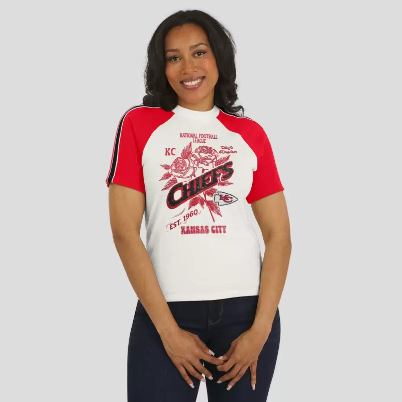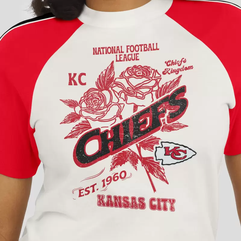 Showcase your Kansas City Chiefs pride with this Sleeve Stripe Distressed Raglan T-Shirt from WEAR by Erin Andrews. The distressed screen print graphics give it a vintage look that adds a touch of timeless style. The contrast-color sleeve stripes and raglan sleeves make this t-shirt a unique addition to your Kansas City Chiefs collection.